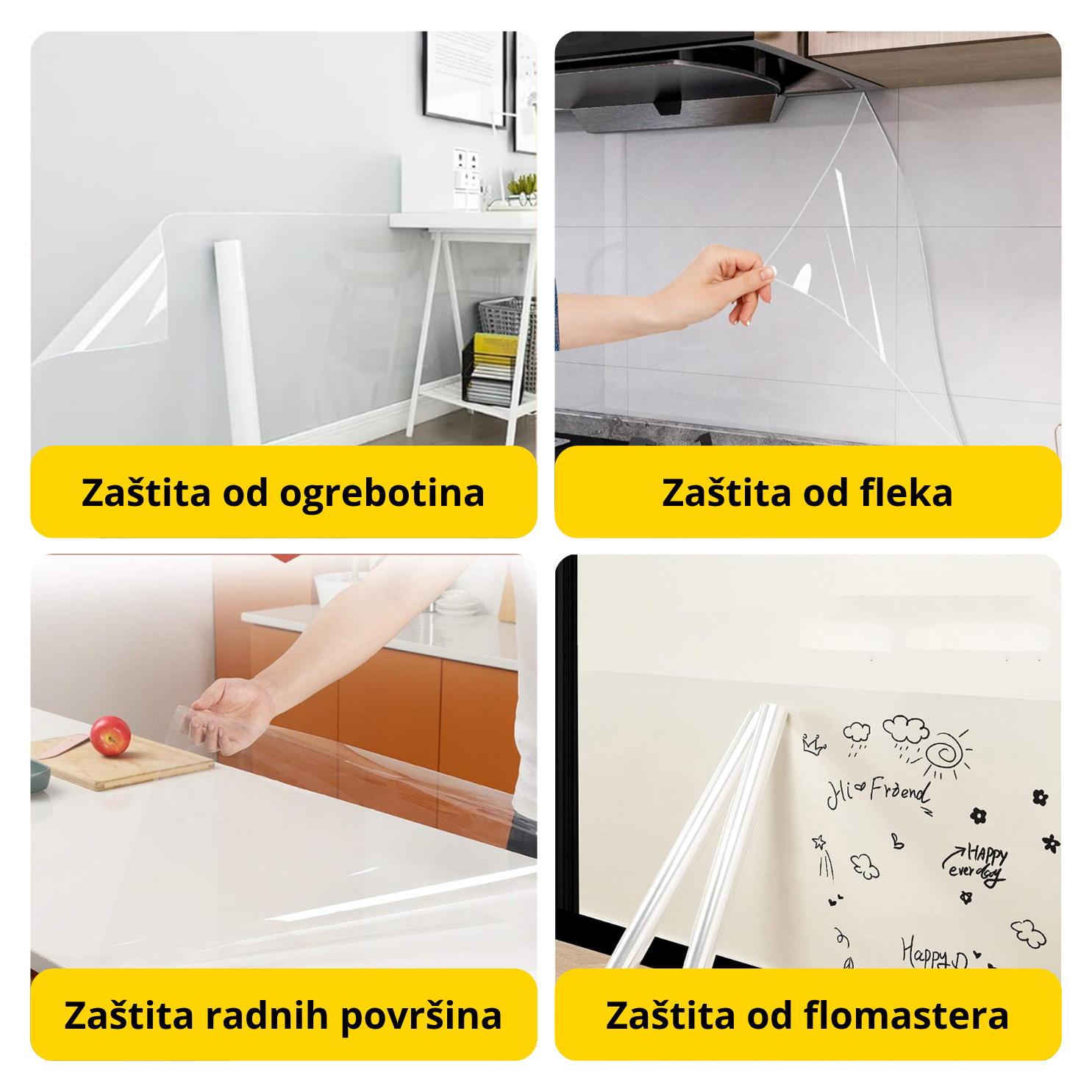 To češ uspeti providnom magičnom folijom, koja bez lepljenja, samo prislanjanjem, postaje prva linija odbrane tvojih površina od štetnih uticaja!