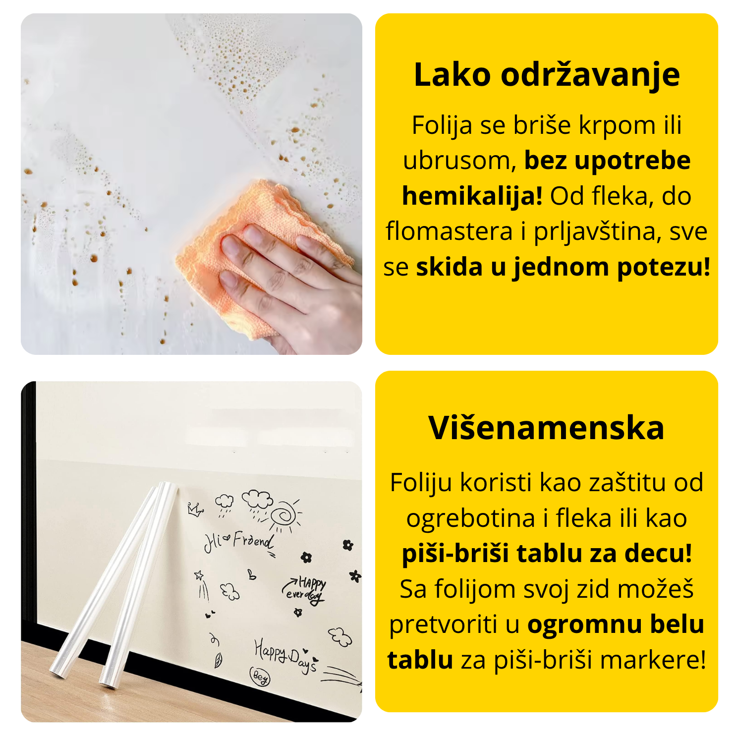 Vodootporna je i ne upija tečnosti, masnoće, prljavštinu ili čak flomastere. Sve to, u jednom potezu krpe ili ubrusa nestaje sa folije i ona ponovo izgleda kao nova! To sa zidom ne možeš da uradiš tek tako, zar ne.